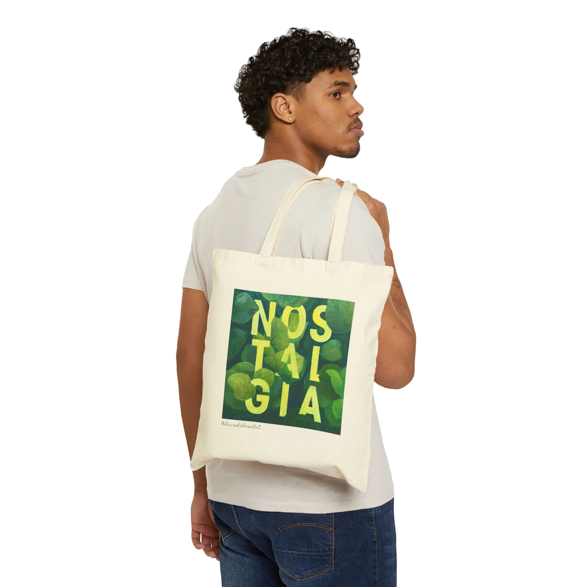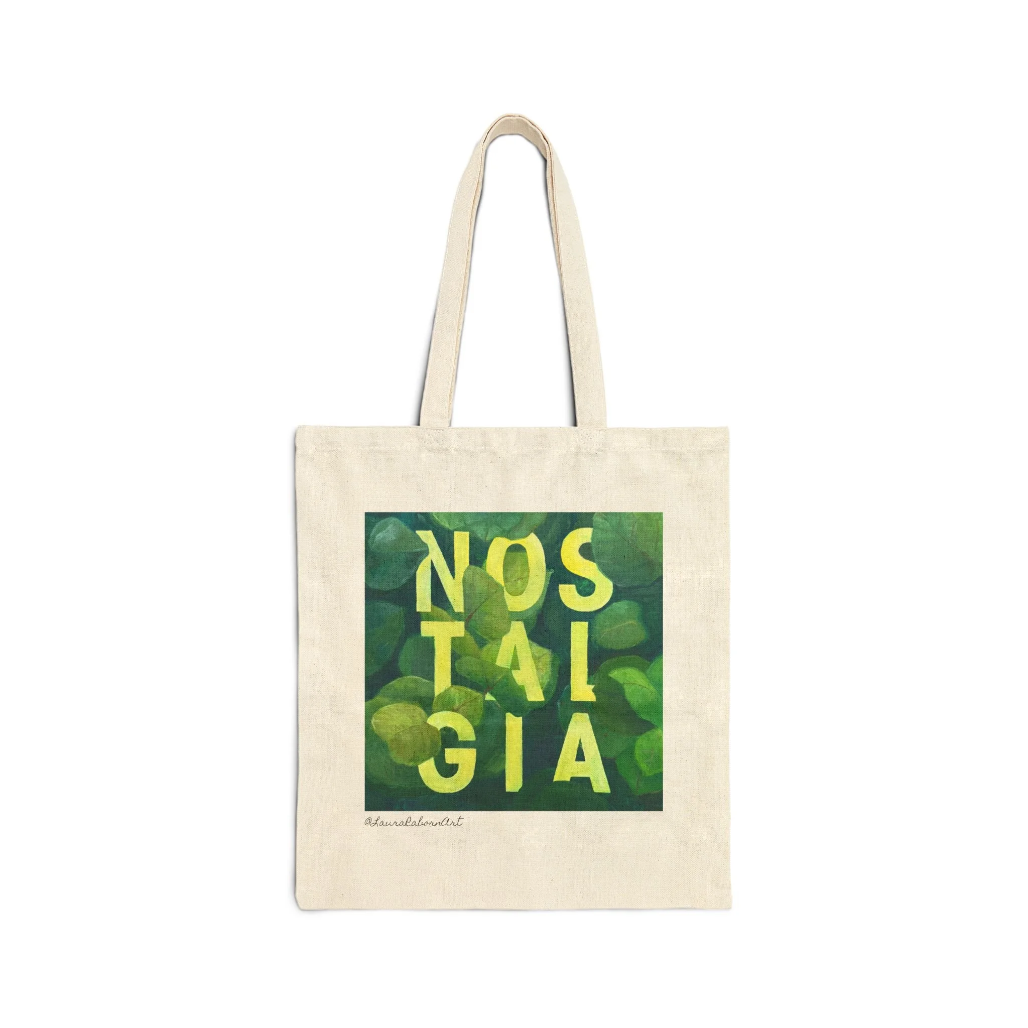 Light, tactile, and quietly expressive — this cotton canvas tote carries more than things; it carries memories. The square print reads NOSTALGIA in layered green and yellow tones that catch light and soften with wear. The heavy 12 oz canvas holds books, market finds, and the small rituals of daily life without sagging. Flat construction keeps the silhouette slim and easy to tuck under an arm or into a bike basket. Reinforced fabric handles feel steady on the shoulder and age with a lived-in softness.